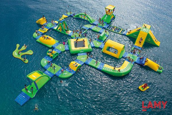 AQUA PARC: en été, un parc aquatique gonflable sur le lac disposant d’une série de toboggans, de trampolines, tous reliés ensemble et flottant sur le lac.